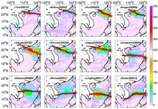 Typhoon tracks and 3-day averaged NIWS (unit in 10−3 N/m2), filtered from wind stress of Climate Forecast System Reanalysis (CFSR) data when Typhoons Yutu (a), Molave (b), Nuri (c), Koppu (d), Imbudo (e), Krovanh (f), Hagupit (g), Xangsane (h), Ketsana (i), Mirinae (j), Lingling (k), and Durian (l) passed over the SCS. The white arrows are the background wind speeds.