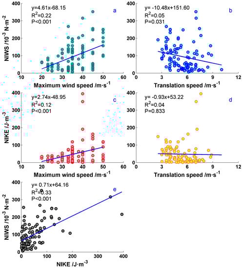 Scatter plots of maximum wind speed (unit in m/s) around the typhoon center and translation speed (unit in m/s) of typhoon versus the corresponding (a,b) NIWS (unit in 10−3 N/m2) and (c,d) NIKE (unit in J/m3) of 12 typhoons. (e) Scatter plot of NIKE against the corresponding NIWS.