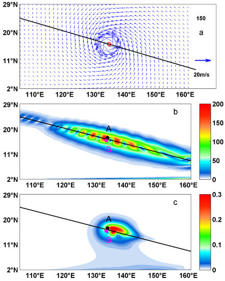 Distributions of (a) the wind field (unit in m/s) of the idealized typhoon at t = 150 h, (b) corresponding NIWS (unit in 10−3 N/m2), and (c) oceanic near-inertial currents (unit in m/s). The black line denotes the typhoon track. The red circle in (a) denotes the typhoon center. The black dot A in (b) and the magenta dot B in (c) are opposite locations on the two sides of the typhoon track.