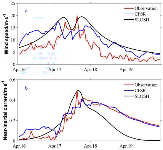 To validate the model, a point (16°85′ N, 133.7° E) on the right side of the idealized typhoon (the black dot A shown in Figure 7b,c), which is about 80 km away from the typhoon track, was chosen to represent the meteorological observation station. The simulated wind speed at this location and the corresponding mixed layer near-inertial currents simulated from the slab model were compared with the observational data (16°83′ N, 112°33′ E) and the CFSR data (16°25′ N, 112°75′ E), respectively (Figure 8). It shows that the SLOSH model results basically match the observations.