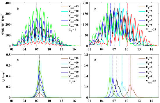 As shown in Figure 6, the relationship between translation speed and NIWS is not clear. Here, based on the validated SLOSH model, nine numerical experiments were conducted to investigate the relationship between translation speed and NIWS (Table 1). Case 1 is the standard experiment validated in Section 3.4, and all numerical experiments were divided into two groups. Cases 1–5 are the experiments for the sensitivity of maximum wind speed (Vmax). Cases 1 and 6–9 are the experiments for the sensitivity of translation speed (UT). The variations of NIWS and oceanic near-inertial currents (Ui) for the nine numerical experiments at location A are shown in Figure 9. When Vmax increases from 15 m/s to 35 m/s, the maximum NIWS increases from 48.6 × 10−3 N/m2 to 352.2 × 10−3 N/m2 (Figure 9a), and the magnitude of oceanic near-inertial currents (Ui) increases from about 0.1 m/s to 0.69 m/s (Figure 9c). When the translation speed (UT) increases from 4 m/s to 5 m/s, the maximum NIWS increases from 152.5 × 10−3 N/m2 to 176.2 × 10−3 N/m2, but when the translation speed (UT) increases from 5 m/s to 8 m/s, the maximum NIWS decreases to 154.6 × 10−3 N/m2 (Figure 9b), and the corresponding Ui increases from 0.24 m/s to 0.39 m/s, monotonically (Figure 9d).