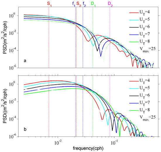 To further investigate the optimal translation speed for the NIWS, the power spectral densities (PSDs) of the wind stress at location A are shown in Figure 10. It was found that both the wind energies at the synoptic band (S1–S2, with periods of 2–6 days) and near-inertial band (f1–f2, i.e., 0.85–1.15f, with periods of 36–48.7 h) are much larger than those at diurnal (D1, with a period of 24 h) and semidiurnal frequencies (D2, with a period of 12 h). Comparing to the eastward components, the northward components of wind energy at the near-inertial band greatly vary with the translation speed (UT). The curves show that the smaller translation speed (e.g., UT = 4 m/s) contributes more energy at the relatively low frequency (e.g., at synoptic band), while the larger translation speed (e.g., UT = 8 m/s) contributes more energy at the relatively high frequency (e.g., at diurnal frequency). These processes lead to the occurrence of the largest near-inertial-band PSD at UT = 5 m/s.