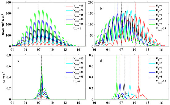 Time series (in days) of NIWS (unit 10−3 N/m2) and oceanic near-inertial currents Ui (unit in m/s) in the mixed layer of fixed location B. (a,c) are the experiment results for the sensitivity of maximum wind speed (Vmax). (b,d) are the experiment results for the sensitivity of translation speed (UT).
