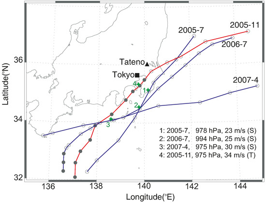 Location of Tokyo (raindrop size distribution (RSD) measured site), location of Tateno (radiosonde sounding station) and tropical cyclone (TC) paths (gray filled circles denote typhoons, and white open circles denote tropical storms; the sea pressure level and wind speed of the nearest TC center to Tokyo were marked in “1”–“4” and listed in the legend).