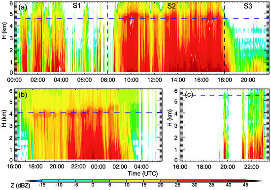 The vertical profile of radar reflectivity from the MRR for (a) one tropical cyclone occurring on 25 August 2005, (b) one meiyu-baiu front occurring on 21 June 2005 and (c) one local storm occurring on 1 August 2007. The blue dashed lines denote the 0 °C isotherm level measured by the Tateno radiosonde sounding station, while the grey dashed lines in (a) denote the three rain stages of the tropical cyclone.