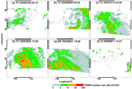 The surface rain rate of four tropical cyclones (TC) (a–d), one meiyu-baiu front (MF) (e) and one local storm (LS) (f) observed by 2A25 data of the precipitation radar (PR) on the Tropical Rainfall Measuring Mission (TRMM) satellite. The “X” denotes the location of Tokyo.