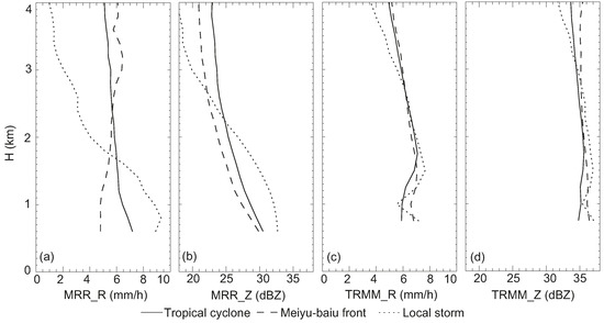The mean rain rate (R) and radar reflectivity (Z) profiles from 0.6 to 4.0 km for the tropical cyclones, the meiyu-baiu front and the local storms based on the MRR are shown in Figure 5a,b, with rain rates at 600 m of >2 mm/h. The R of the tropical cyclones and the local storms showed negative gradients, while that of the meiyu-baiu fronts showed a positive gradient (Figure 5a). The Z presented nearly negative gradients for these three rain types (Figure 5b). At low-level heights below 1.8 km, the R and Z generally decreased in the following order: local storm > tropical cyclone > meiyu-baiu front (Figure 5a,b).
