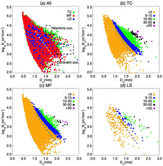 Scatterplot of Dm versus log10Nw for (a) all three rain types and for different rainfall rates in (b) tropical cyclones, (c) meiyu-baiu fronts and (d) local storms based on JWD data. The two gray rectangles correspond to the maritime and continental convective fields reported by Bringi et al. [34]. The dashed line is that of Bringi et al. [34], which distinguishes stratiform rain from convective rain.