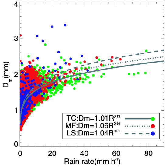 Figure 7 presents a scatterplot of Dm–R and fitted power law relationships with the three rain types to study the variability in the Dm with rain types and R. The positive exponents in the relationships of Dm–R suggested that the Dm values increased with the rain intensity, possibly due to more efficient coalescence mechanisms [11,12]. Notably, at high R, Dm remained at a constant value due to the RSDs reaching an equilibrium state where coalescence and breakup of raindrops were nearly in balance [36]. The local storms had the largest exponent values of the Dm–R relationship among the three rain types. Hence, for a given rain rate, the rain from a local storm had higher Dm values than the tropical cyclone and meiyu-baiu front events.