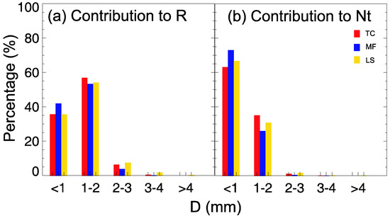 The percentage contribution of various-diameter raindrops to (a) R and (b) Nt (total number concentration) for the three rain types based on JWD data.