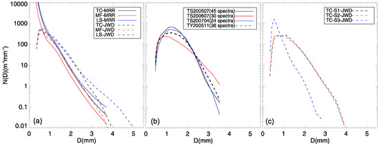 As mentioned above, the RSD of tropical cyclones varied with their temporal evolution; herein, the typhoon event (2005-11) was investigated in three stages as it passed Tokyo (Figure 3a) to determine the RSD temporal variability in this tropical cyclone. Both stages 1 and 2 were associated with the eyewall before tropical cyclone landfall and exhibited intermittent and continuous rainfall, respectively (Figure 3a). Stage 3 was associated with the eye and eyewall after tropical cyclone landfall (Figure 3a). Note that the classification of these three stages is only based on microphysical variations. Figure 9c presents the JWD-based RSD for the three stages. The RSDs of Stage 1 (S1) and Stage 2 (S2) were highly coincident, while the RSD of Stage 3 (S3) was obviously different from those of S1 and S2, with higher concentrations of midsize and large drops in S1 and S2 than in S3(Figure 9c). The RSDs of S1 and S2 were also similar to the composite JWD-based RSD for the four tropical cyclones, especially for midsize- and large-raindrop RSDs (Figure 9a,c), indicating that the microphysical characteristics of rainfall during the entire tropical cyclone were mostly dominated by those of the eyewall.