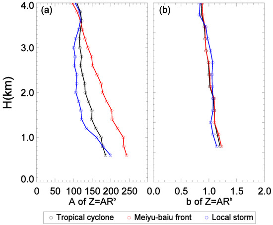 Figure 10 presents the vertical distributions of coefficient A and power b of the Z–R relationship for the tropical cyclone, meiyu-baiu front and local storm based on MRR data. The value of A decreased from 186 to 109 (243~96 and 199~104, respectively) with increasing height (i.e., 0.6 km and 4.0 km, respectively), and simultaneously, the value of b decreased from 1.20 to 0.80 (1.23~0.79 and 1.14~0.72, respectively) at the same heights for the tropical cyclones (the meiyu-baiu front and local storms). The vertical variation in b for both the tropical cyclones and meiyu-baiu front was very similar.