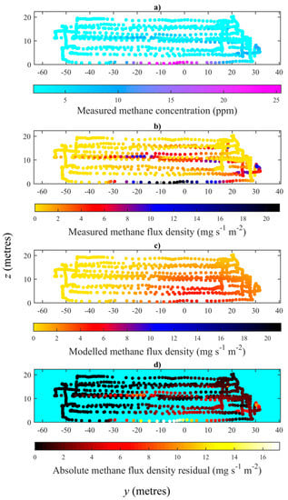 Here, we describe the procedure applied to each UAV flight from the sample data in order to estimate an initial flux using the NGI method. The qme, as a function of y, z, and x, was calculated using Equation (2), assuming constant ρ. The qme is the emission flux per unit area on the flux plane, derived from each individual [CH4]me measurement (see Figure 1b for flight 2, for example). As Equation (2) requires the concentration enhancement over the background, instrumental resolution (1 ppb for the sample data) can be a limiting factor in the magnitude of fluxes detectable: If fluxes are too low, concentration enhancements may be undetectable.