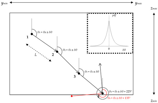 A schematic of the random walk simulation with an example δθ exponential probability distribution function (pdf) in the top right hand corner. Each step in the random walk is numbered from 1 to 4. Upon reaching the plane boundary at point 4, a deflection of 225° was applied, since a deflection of 135° (red square) failed to keep the random walk within the confines of spatial sampling. The sampling plane spans from the minimum real y measurement (ymin) to the maximum real y measurement (ymax) and from the minimum real z measurement (zmin) to the maximum real z measurement (zmax).