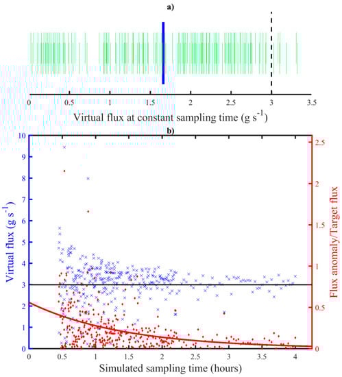 The difference between Ft and simulated flux (Fe,v) was assessed at a fixed simulated sampling time corresponding to the duration of actual sampling for each flight in the sample data. Fluxes for this analysis were derived by continuously repeating a random walk simulation to accumulate a large number (180 for the sample data) of virtual fluxes (see green lines in Figure 3a for example). The average value of Fe,v (, solid green line in Figure 3a) was negatively biased from Ft due to three independent effects.