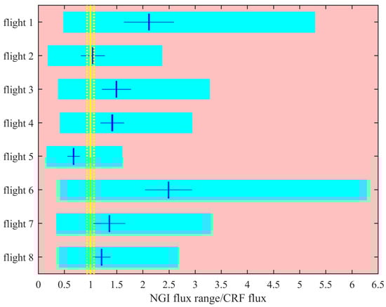 Near-field Gaussian plume inversion (NGI) flux results for the sample data, expressed as a ratio to the controlled release facility (CRF) emission flux. The calculated uncertainty flux range (from ΔF− to ΔF+) is expressed as a cyan bar and Fe is a vertical blue line for each flight. The ΔFm range is expressed as a horizontal blue line. The solid yellow line represents Fe being equal to the CRF flux.
