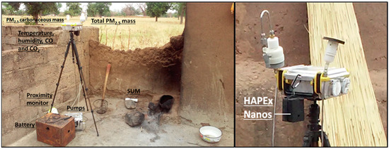 Microenvironment sampling apparatus deployed at a typical rural kitchen in the Kassena-Nankana (KN) district. Additional monitoring instrumentation is shown including a stove use monitor (SUM) and participant proximity monitor.