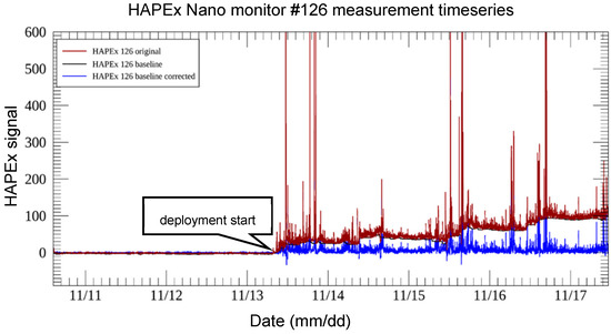Issues encountered with the HAPEx Nano included (1) programming incorrect instrument settings resulting in logging all zeros (n = 10 deployments or 28,800 min; fortunately, many were paired with another working monitor); (2) battery failure that went unnoticed due to a lack of clear indicators (n = 3–5 deployments); (3) firmware settings with not a number (“NaN”) values logged below −99 (n = 2 deployments or 5680 min); and (3) connectivity issues between HAPEx monitors and the computer, most likely caused by corrosion of the USB terminal by moisture over the two-year sampling campaign (8–15 HAPEx monitors). Others reported failure rates >40% in the field, which is still a major challenge facing the uptake of low-cost tools [20]. Duplicate measurements are highly recommended. However, it is important to note that the HAPEx signal is a product of on-board, proprietary firmware algorithms developed by the manufacturer (Climate Solutions Consulting) for the Sharp GP2Y1010, whereas our signal processing is conducted on raw 1-min outputs from averaged 20-s HAPEx Nano readings; therefore, it is directly applicable to others using the HAPEx Nano (v.3).
