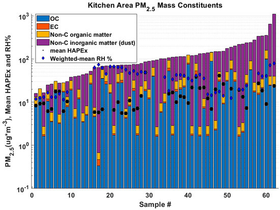 Breakdown of gravimetric 48-h particulate matter less than 2.5 microns in diameter (PM2.5) mass concentrations by organic carbon (OC), elemental carbon (EC), non-carbonaceous organic matter, and non-carbonaceous inorganic matter with associated HAPEx-weighted mean relative humidity (RH, %) and mean baseline-corrected HAPEx signal. Note the logarithmic y-axis.