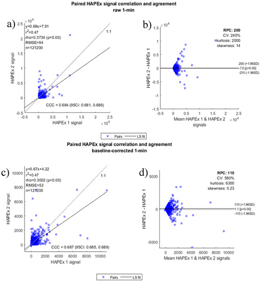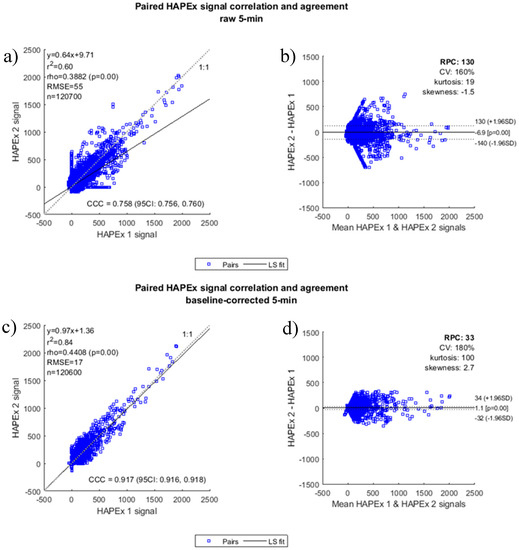 Scatterplots (a,c) and Bland–Altman plots (b,d) of paired, 5-min rolling averaged HAPEx signals for raw (a,b) and baseline-corrected (c,d) data. Pearson’s correlation (r), Lin’s concordance correlation coefficient (CCC) with 95% confidence intervals (95CI), a linear least squares fit (LS, solid line) with root mean squared error (RMSE), coefficients of variation (CV) and coefficients of reproducibility (RPC) are reported.