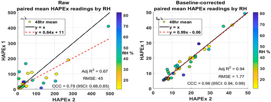 The 48-h mean paired HAPEx readings from (a) raw and (b) baseline-corrected data colored by HAPEx-weighted mean RH (%). Coefficients of determination (R2), root-mean-squared error (RMSE) and Lin’s concordance correlation coefficients (CCC) with 95% confidence interval (95CI) are reported.