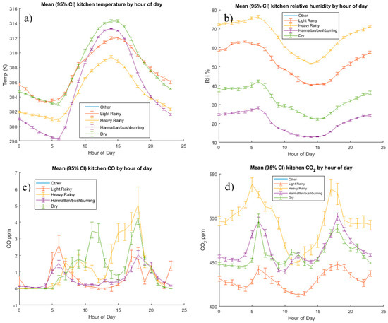 Time-of-day plots marking mean (95% CI) (a) temperature (K), (b) relative humidity (%), (c) CO concentration (ppm), and (d) CO2 concentration (ppm) G-Pod measures in study kitchens by hour of the day and colored by season. “Other” is a transitional season of two weeks between “dry” and “light rainy” seasons.
