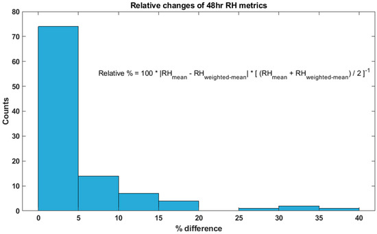 Figure 8 illustrates the difference between means and HAPEx-weighted means for an overall relative humidity value over a 48-h period. Sixteen HAPEx monitor deployments had at least a 10% relative difference between the 48-h RH mean and weighted mean. Similar findings were discovered for other covariates (i.e., CO, CO2, and temperature).