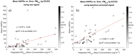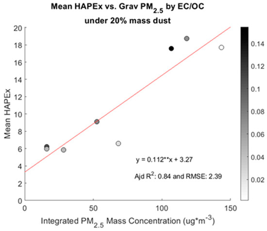 Regressions of 48-h mean HAPEx readings on integrated PM2.5 mass constituents show interesting trends. Firstly, Figure 9 illustrates the relationship between (a) raw and (b) baseline-corrected 48-h mean HAPEx readings and total PM2.5 mass concentration (μg∙m−3). The baseline-corrected data mean HAPEx signal (R2 = 0.48) explains more than twice as much variation in total integrated filter mass concentration as the raw data (R2 = 0.22). For baseline-corrected HAPEx signal, both the intercept (5.0, 95% CI: 1.9–8.8) or modeled HAPEx signal in clean air and slope (0.089, 95CI: 0.061–0.117) or particle coefficient are significant (p < 0.05). For raw HAPEx data, the slope is substantially higher (0.479). Points are colored by EC/OC, with higher values corresponding to darker shades. Elemental carbon absorbs more light relative to OC and would in theory result in less scattered light available for the photodiode to detect. Black carbon (BC), a close counterpart to EC, is commonly measured optically using light absorptivity principles. When the regression is limited to gravimetric samples containing less than 20% mass of dust (Figure 10), the slope increases slightly to 0.112 (0.067–0.157, p < 0.05) and 84% of mean HAPEx variance is explained by total PM2.5 mass concentration. This slope reflects HAPEx sensitivity to primary biomass emissions. Regressions of mean HAPEx readings on EC, OC, or TC show poor correlation, whereas dust mass alone explains 46% of HAPEx variance. Moreover, regressions grouped by urban/rural and season were explored, showing variability in slopes and intercepts across those dimensions (Figure S5, Supplementary Materials).