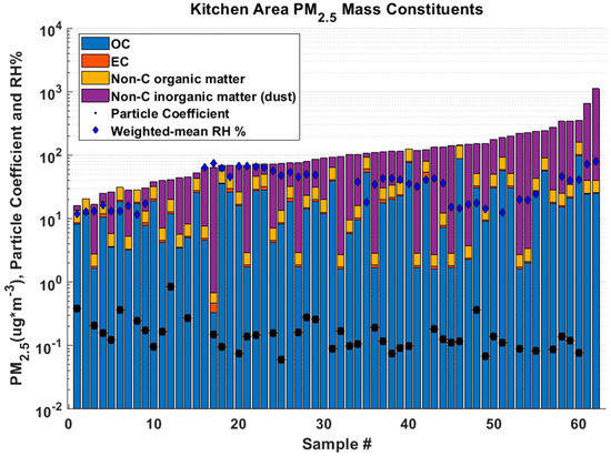 Breakdown of gravimetric 48-h PM2.5 mass concentrations by organic carbon (OC), elemental carbon (EC), non-carbonaceous organic matter, and non-carbonaceous inorganic matter with associated HAPEx-weighted mean RH (%) and particle coefficients. Note the logarithmic y-axis.