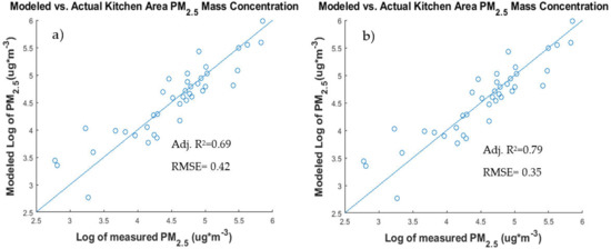 Modeled log of 48-h integrated PM2.5 mass concentrations vs. log measured PM2.5 mass concentrations using (a) Equation (7) without a pointwise RH correction, and (b) Equation (8) with pointwise RH-corrected data. Full model results can be found in the Supplementary Materials.