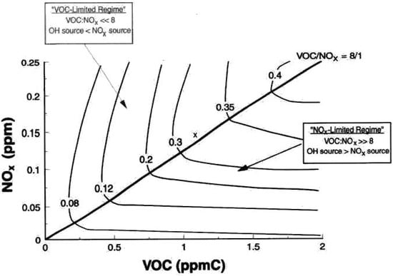 An important conceptual outgrowth of application of chamber experiments that resulted in the NOx-VOC-O3 relationship traces back to Haagen-Smit’s research, and the reports of Romanovsky et al. [] and Hamming et al. []. This relationship was represented from chamber experiments as the widely cited Haagen-Smit “mountain” diagram, shown, for example, in Figure 3. The diagram shows the two idealized regimes of initial NOx sensitivity and VOC sensitivity vs. the maximum O3 expected nominally during late morning to mid-day hours. The NOx sensitive regime is in the high initial VOC/NOx regime to the left of the line of slope of VOC/NOx ~8:1. The VOC sensitive regime of relatively low initial VOC/NOx is to the right of the ridge line. These regions are separated by isopleth contours that show maximum O3 formation with VOC/NOx ratio. The idealized relationship on Figure 3 was demonstrated early on from a selection of experiments with different VOC/NOx ratios. The relationship was calculated using the empirical kinetic modeling approach (EKMA) chemical model []. The mapping in the figure established a qualitative basis for precursor management that would estimate the average maximum expected O3 concentration. This approach evolved from simple, empirical (mainly VOC) roll-back schemes for O3 precursor reduction [].