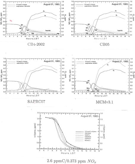The current regulatory practices have evolved to adapt models for diurnal change in precursors using chemical transport models accounting for daily oxidant chemistry with precursor emissions and meteorological conditions for air transport and mixing []. Compressed kinetics calculations found in several air quality models, including the urban airshed (chemical transport) model (UAM) [], the regional, RADM, “engineering” version [] and versions of community multiple (spatial and temporal) scale chemical transport model (CMAQ) []. This portfolio of models is said to approximate by computer the “real” lower troposphere (see also Section 4).