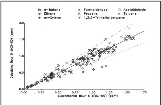 In another example, Carter and Lurmann [] discuss a systematic evaluation of the SAPRC-90 detailed mechanism [] with smog chamber data. One approach in their study is a test to see how well the mechanism predicts O3 concentrations for a range of different VOCs. Carter’s scatter plot in Figure 5 compares chamber measured O3 produced (O3-NO) after a period of time (5 h) with model calculated values []. The graph indicates the model calculation gives (O3-NO) production to within approximately 30% for a range of single VOC chamber experiments. This result is found even though the reactivity of the chosen VOCs varies widely.