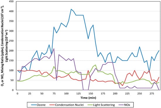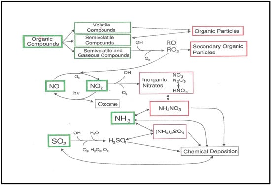 Aerosol experiments have included not only NOx- oxidant-related VOC mixtures to produce oxidant, but have added a variety of aerosol-forming VOC (single and mixtures [,,]) and SOx as SO2− sulfuric acid to seek knowledge of the aerosol-forming kinetics expected in the atmosphere.