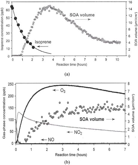 Smog chamber experiments have enabled the study of mechanisms relevant to photochemical aerosol--well beyond the early experiments of Los Angeles smog. Atmospheric chemical reactions of VOCs contribute to their degradation to final endpoints of CO and CO2. Intermediate stages of degradation by mass are mainly short-lived gas phase and condensed products. The photochemical formation of organic particles from carbon number species >C7 was established after the 1970s both in smog chamber experiments and in the field [,,,,,,,,]. The main thermodynamic criterion for aerosol formation was a low vapor pressure for products that would partition significantly into the condensed phase. The time series for particle production in chambers coupled with O3 as an index for oxidation; the increase in O3 concentration parallel with aerosol production are noted in comparison between the gas-phase product-time profiles in Figure 4. The relationship between O3 (or odd oxygen) and SOA concentrations also has been documented in ambient air, e.g., in the southeastern US [] and in Mexico City [].