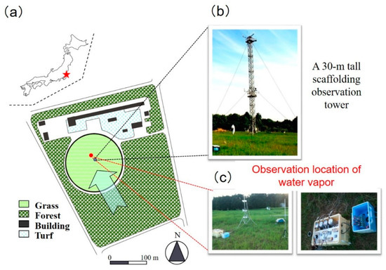 We conducted this study at the experimental fields of the Center for Research in Isotopes and Environmental Dynamics (CRiED) at the University of Tsukuba, Japan (36.1 °N, 140.1 °E), 27 m above sea level (Figure 1a). The mean annual air temperature between 1981 and 2005 was approximately 14.1 °C, and the mean annual precipitation was approximately 1159 mm based on observations at the site. Pine stands and lawn surround the flat, circular field, with a diameter of 160 m. In 2010, mowing was performed on day of year (DOY)213–214. The ground surface was covered by litter composed of mown and dead plants from previous years. The top of the fertile volcanic ash is approximately 2 m thick, under which there is a clay layer. Routine micrometeorological (e.g., downward solar radiation, air temperature, relative humidity, wind speed, and soil heat flux) and eddy covariance measurements (sensible heat flux and latent heat flux) were conducted in the experimental fields of the Center for Research in Isotopes and Environmental Dynamics (Figure 1b). The details regarding the instruments and the database were summarized in Table 1 and more information was described in the literature [35]. We collected a database of stable isotope compositions in different water pools during the three experimental days (Figure 1c).