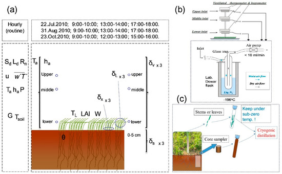 (a) Description of the dataset of routine measurements and in situ isotopic samplings. (b) Water vapor sampling system modified from Yamanaka and Akiyoshi, 2007 [36]. (c) Stems, leaves, and soil sampling.