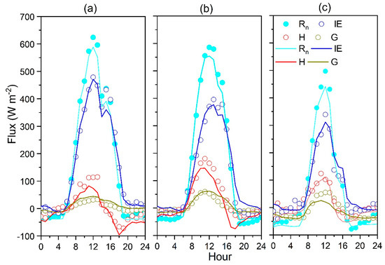 Diurnal variations in the observed (circles) and simulated (lines) energy fluxes (Rn is net radiation, lE is latent heat flux, H is sensible heat flux, G is ground heat flux) during observation periods.