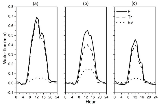 Diurnal variations in evapotranspiration (E), plant transpiration (Tr), and soil evaporation (Ev) simulated by the Iso-SPAC model.