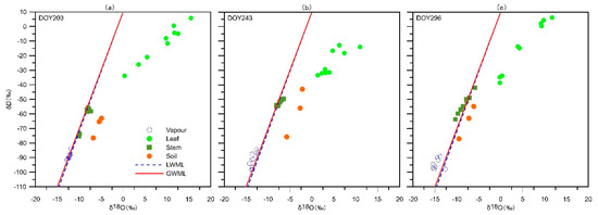 Figure 5 shows a plot between δ18O and δD for all soil, vapor, stem, and leaf water samples for each observation day. The local meteoric water line (LMWL) described by δ2H = 10.2 + 8.2 δ18O [39]. Our measurement results show a consistent pattern of the three observed days. We find that the isotopic composition of surface soil and leaf water deviated from LMWL, which implied that the isotopic kinetic fractionation process at the interface was caused by soil evaporation and plant transpiration. The stem water mainly lies within the LMWL, indicating that the plant water use origin was from precipitation. The isotopic composition of water vapor lies within or slightly deviated from the LMWL, suggesting a departure caused by local recycling effects. Based on the dataset of δV at three levels, the Keeling plot approach, which was used to estimate the δE at each experimental period, is summarized in Table 6. In the daytime (from 08:00 to 18:00 LST), the modeled δE seems to be controlled by LAI. Specifically, the average δE signatures based on the Keeling plot are −9.68‰ when LAI was 2.1 on DOY 203, −16.02‰ when LAI was 0.9 on DOY 243, and −12.17‰ when LAI was 1.5 at DOY 296. This may be because the transpiration fraction is higher when LAI is greater, inducing a high δE [40].