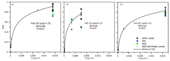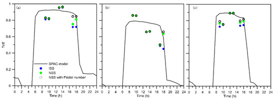 Figure 7 shows the diurnal variations in transpiration fraction (Tr/E) calculated by Tr and E from the Iso-SPAC model, Tr/E estimated by the stable isotope method using δE from the Keeling plot approach, and δEv and δTr from the Iso-SPAC model. Tr/E from Iso-SPAC showed similar diurnal patterns among all three days. Moreover, the value of Si for Tr/E is generally small, suggesting that Tr/E is insensitive to errors in assigned values of all of the parameters. Additionally, day-to-day results show that higher contributions from transpiration from 09:00 to 17:00 LST are found when LAI is higher. Specifically, the mean (standard deviation) values of Tr/E are 0.91 (0.02), 0.70 (0.05), and 0.86 (0.03), with respective LAI of 2.1, 0.9, and 1.5. A lower fraction of less than 0.2 (close to 0) is found during nighttime for all three days. In the three sub-models, the diurnal variation of Tr/E was reasonably captured by the NSS and NSS Péclet. Differences between the isotope method and the Iso-SPAC model vary from 1% to 13%m with an average value of 7.6%. A previous report [41] on the differences between the isotope method and lysimeter plus sap flow measurements range from 4% to 26%, with an average of 15.6%. Considering the uncertainties in isotope measurements, the reasonable agreement between these two methods demonstrates the reliability of the present partitioning results.