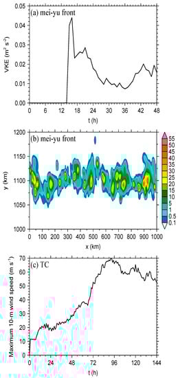 Simulated (a) times series of mass-weighted average vertical kinetic energy and (b) 1-h accumulated precipitation at t = 26 h (shaded; mm) for the mei-yu front. (c) Simulated time series of maximum 10-m wind speed for the tropical cyclone (TC).