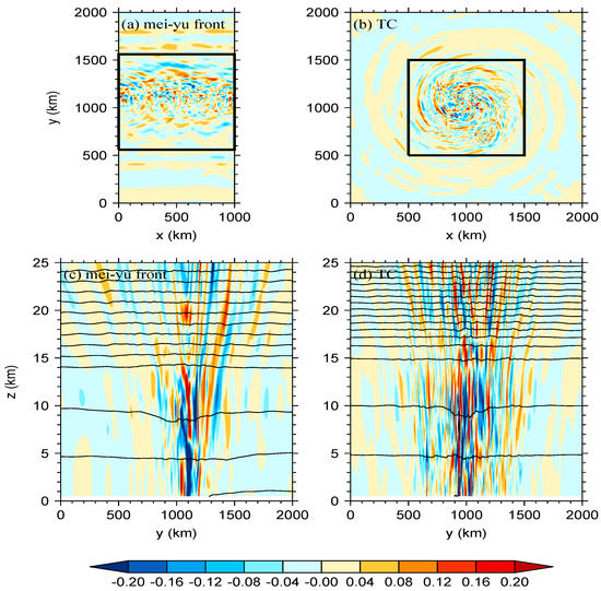 Simulated (a,b) horizontal cross sections of vertical velocity (shaded; m s−1) at z = 17 km, (c,d) vertical cross sections of vertical velocity (shaded; m s−1) and potential temperature (contours every 20 K) along (c) x = 500 km and (d) x = 1000 km. The left panels are for the mei-yu front at t = 26 h and the right panels are for the TC at t = 104 h. Boxes in the top panels indicate the wave analysis domains.