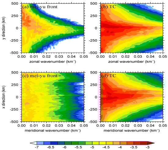 Base-10 logarithm of PSDs of (shaded; m2 s–2) as a function of (a,b) zonal wavenumber and y direction, and (c,d) meridional wavenumber and x direction at z = 17 km, for (a,c) the mei-yu front and (b,d) the TC.
