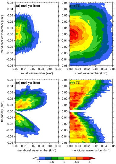 Base-10 logarithm of PSDs of (shaded; m2 s–2) as a function of (a,b) zonal and meridional wavenumber, and (c,d) meridional wavenumber and frequency at z = 17 km, for (a,c) the mei-yu front and (b,d) the TC.