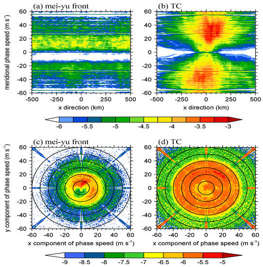 Base-10 logarithm of PSDs of (shaded; m2 s–2) as a function of (a,b) x direction and meridional phase speed, and (c,d) zonal and meridional component of horizontal phase speed at z = 17 km for (a,c) the mei-yu front and (b,d) the TC. The black rings in the bottom panels show the magnitude of horizontal phase speed at each 10 m s−1.