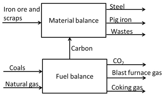 Figure 1 represents the amount of carbon that is stored in products (main products and by-products). This amount can be obtained from the difference between carbon contained in all products and in raw materials (iron ore and scraps). It should be mentioned that “Pig iron” flow represents the amount of pig iron that is not processed into steel. Based on the scheme in
