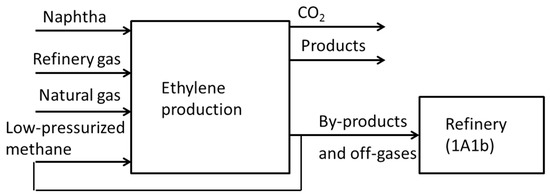 Naphtha, refinery gas, low-pressurized methane, and natural gas are used as feedstocks. During the reaction in the ethylene unit a refinery gas with high content of methane is formed. This methane is separated from the refinery gas and creates an inner loop in the process. Therefore the low-pressurized methane cannot be excluded from the reference approach. The rest of refinery gas (after separation of methane) is going into refinery and it represents an input stream for emission estimates in the Energy Sector (1.A.1.b category). On the other hand, another stream of refinery gas is outgoing from refinery and it represents the input stream in the ethylene unit