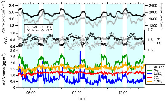 - Ortega, A.M.; Hayes, P.L.; Peng, Z.; Palm, B.B.; Hu, W.; Day, D.A.; Li, R.; Cubison, M.J.; Brune, W.H.; Graus, M.; et al. Real-time measurements of secondary organic aerosol formation and aging from ambient air in an oxidation flow reactor in the Los Angeles area. Atmos. Chem. Phys. 2016, 16, 7411–7433. [Google Scholar] [CrossRef]