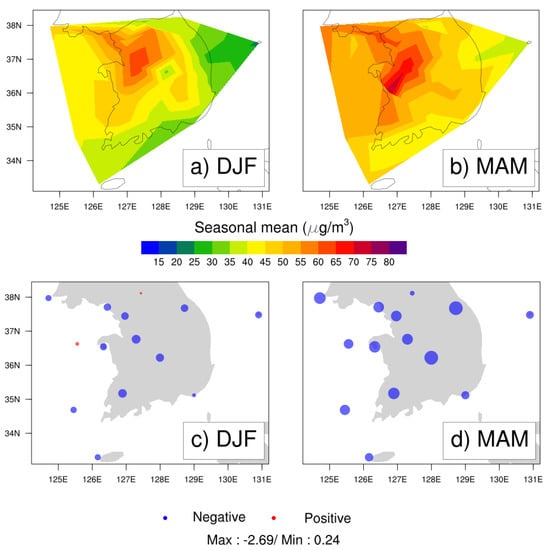 (a,b) Seasonal mean concentrations of daily particulate matter smaller than 10 μm in diameter (PM10) for all station, and (c,d) their linear trends measured at 14 stations from 2004 to 2016 for (a,c) DJF and (b,d) MAM are shown. The trend is estimated using the linear regression coefficient of monthly PM10 concentration, and has a unit of μg m−3 per month. The size of the dot is proportional to the absolute value of the regression coefficient, with the blue having a negative value and the red having a positive value.